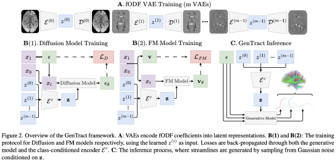 The authors train \(m\) different VAEs that learn to compress the spherical harmonics (SH) volume representing the fODFs. Each \(m_i\) VAE learns a latent representation of a different coefficient of the fODF map.