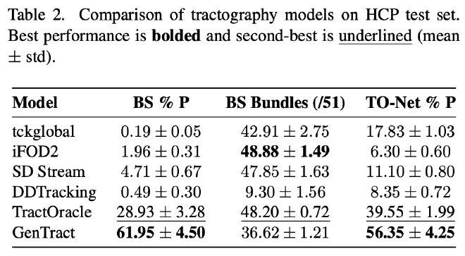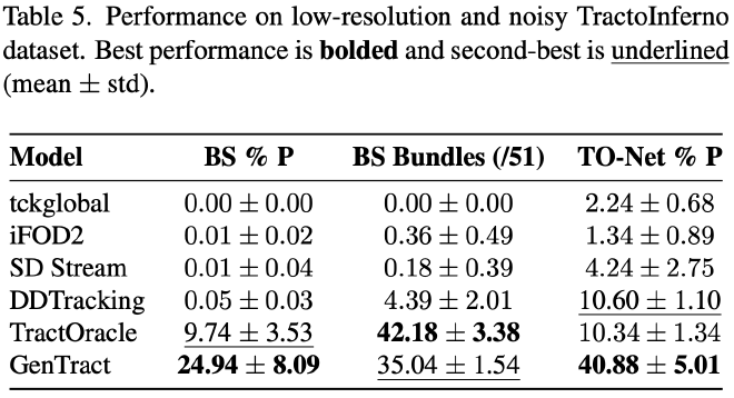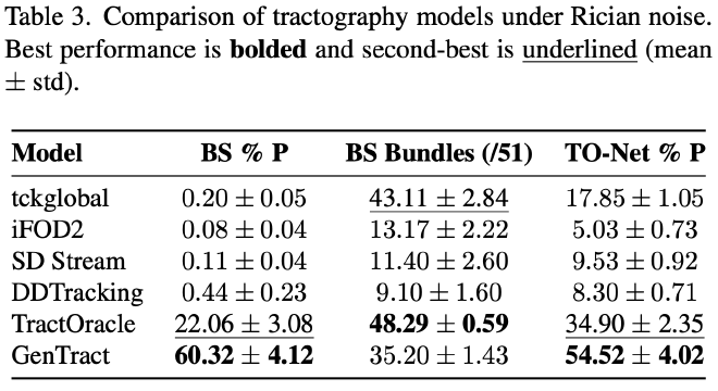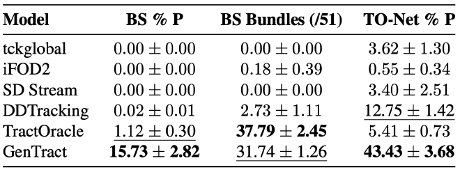 Performance on TractoInferno (Rician noise + downsampling)The authors also note that the computation time for GenTract is comparable to TractOracle and DDTracking (slightly slower than both), while still being orders of magnitude faster than other methods.